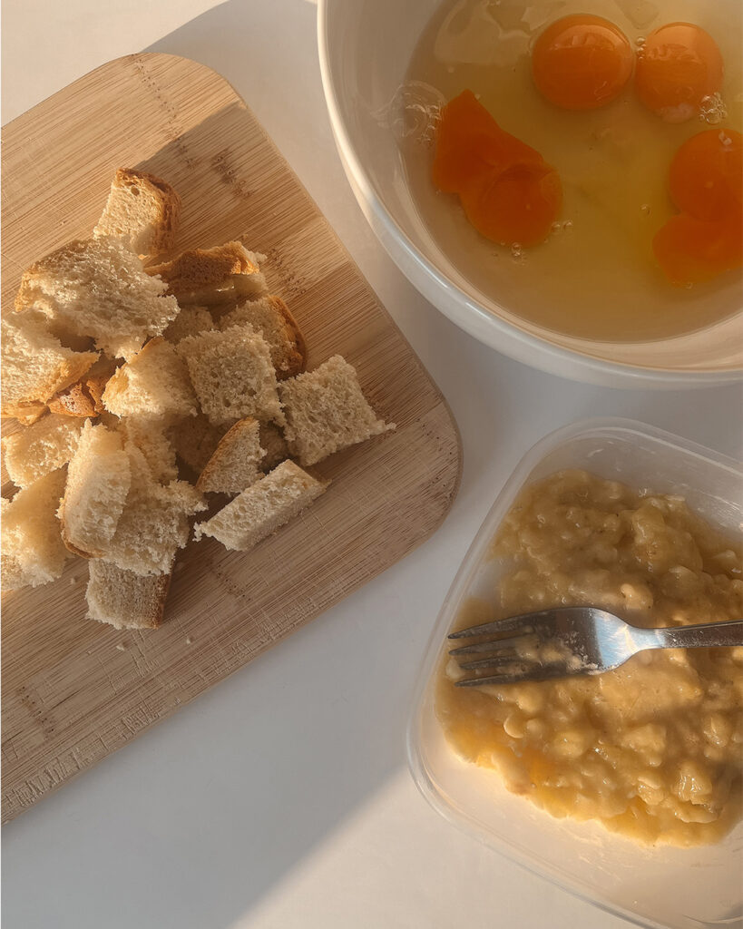 - a kenyeret vagy kalácsot vágjuk kockákra és áztassuk be a masszába