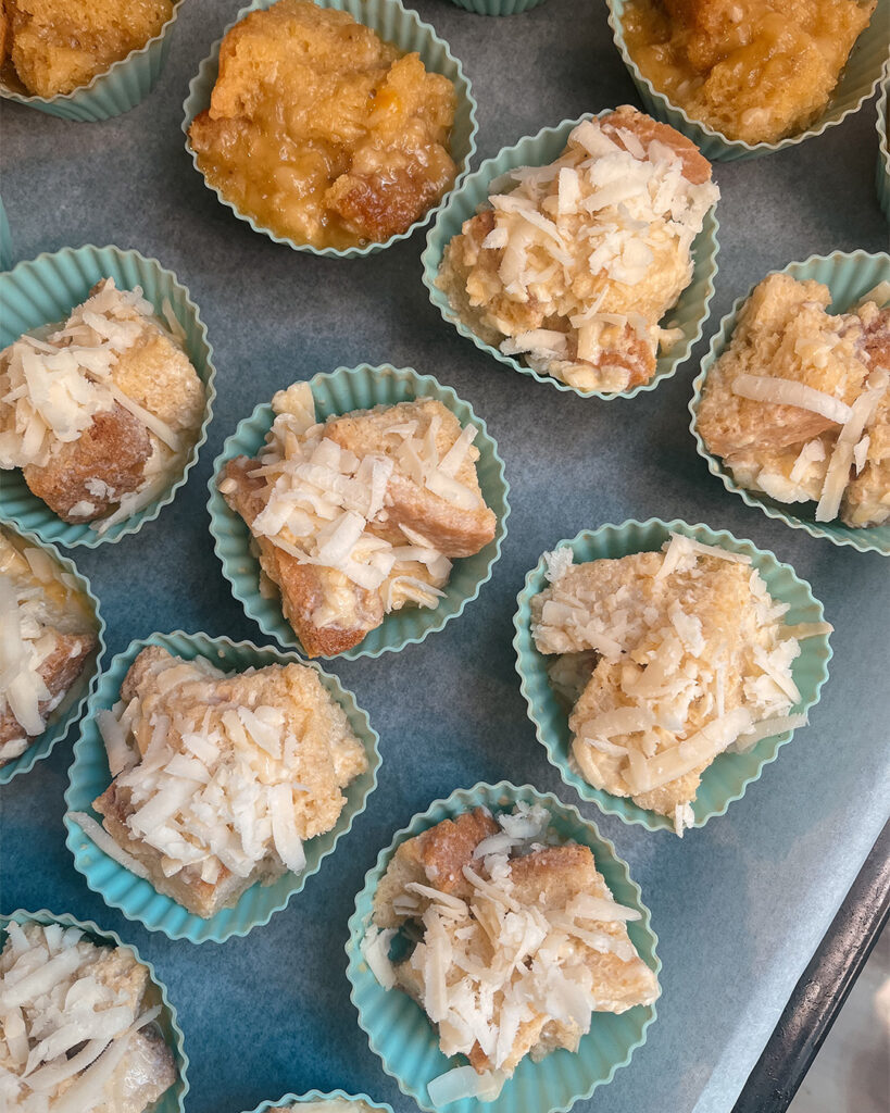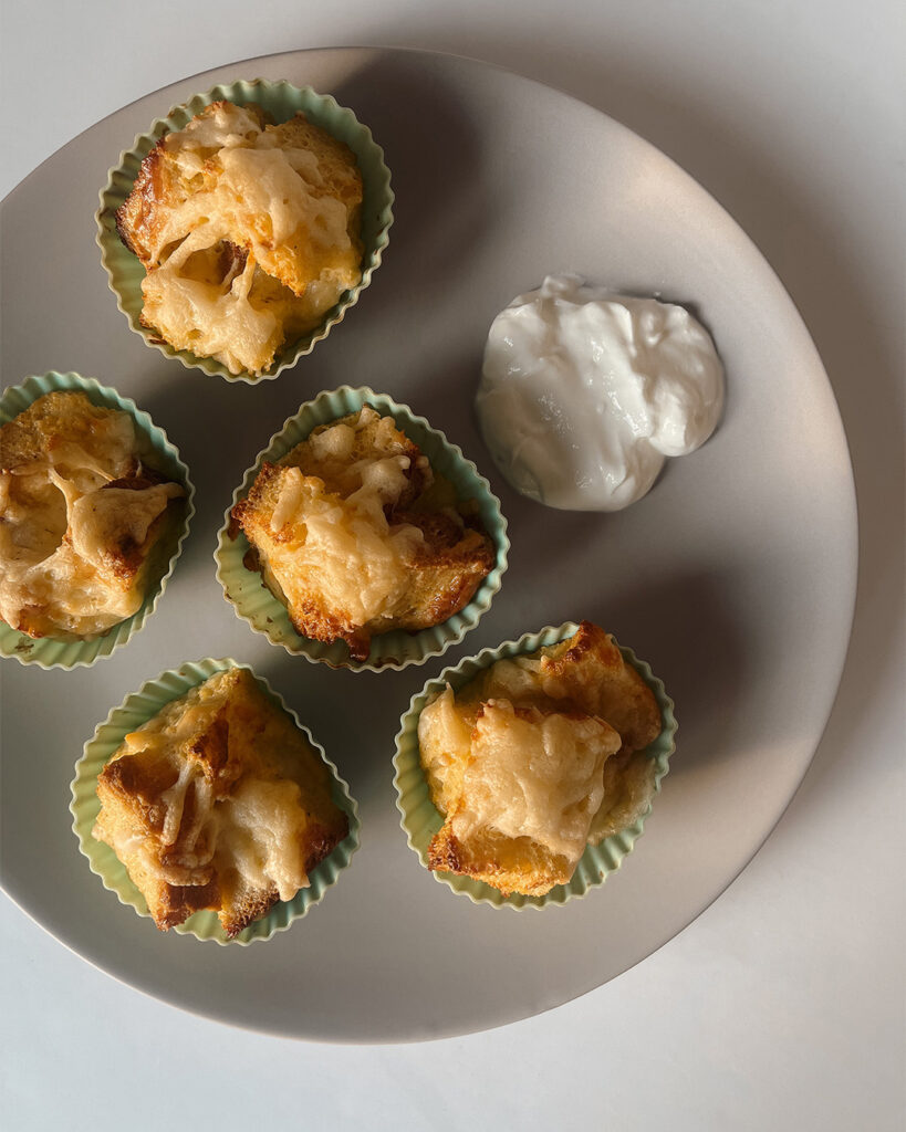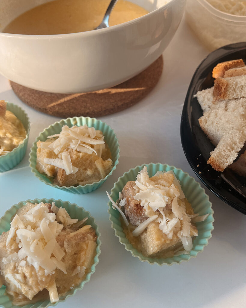 • adagoljuk a muffin kapszlikba a megázott kenyér kockákat és szórjuk meg sajttal