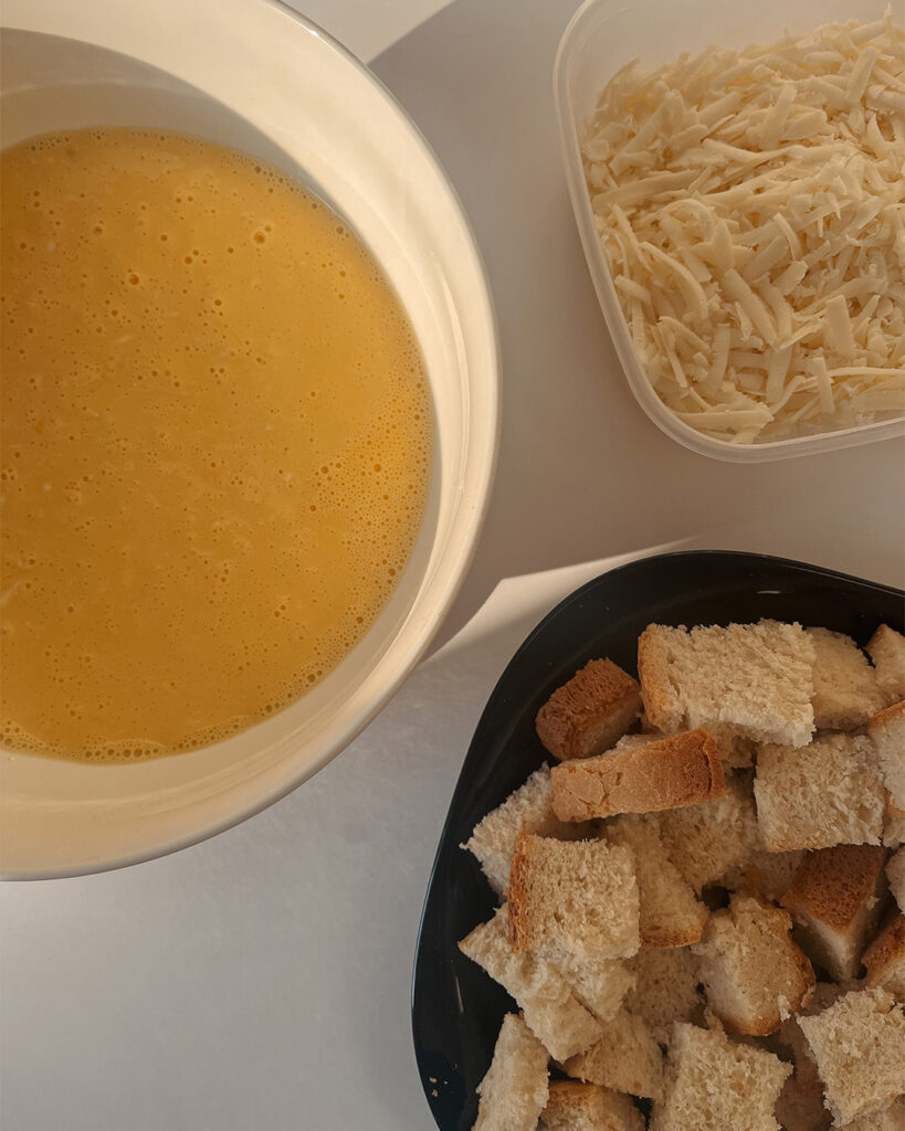 • dobjuk bele a felkockázott kenyeret, és hagyjuk, hogy egy kicsit megszívja magát (forgassuk át, hogy minden kockát érjen a massza)