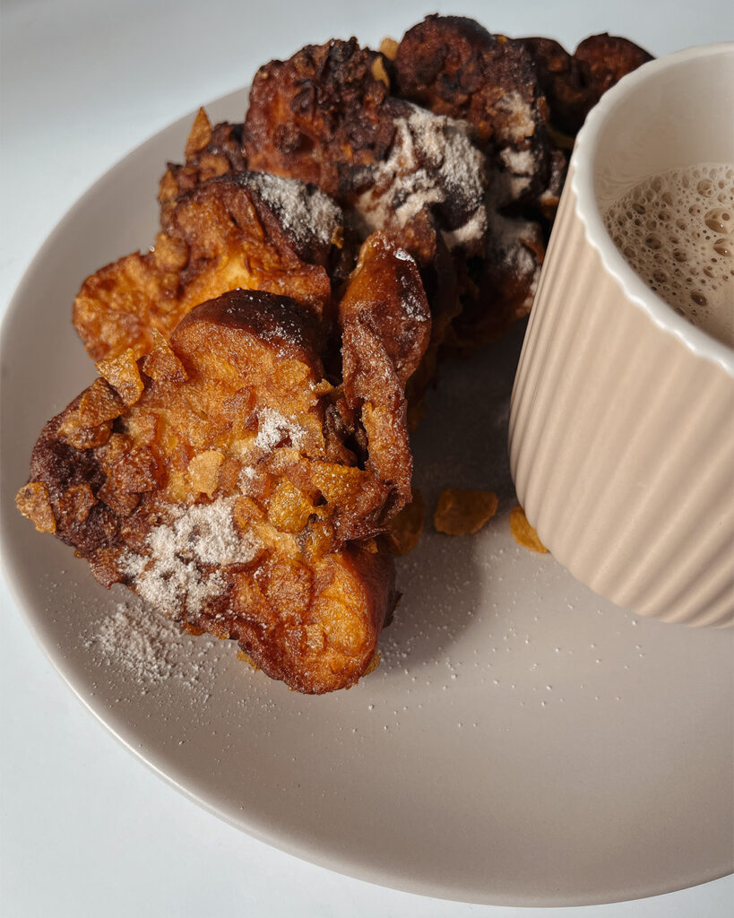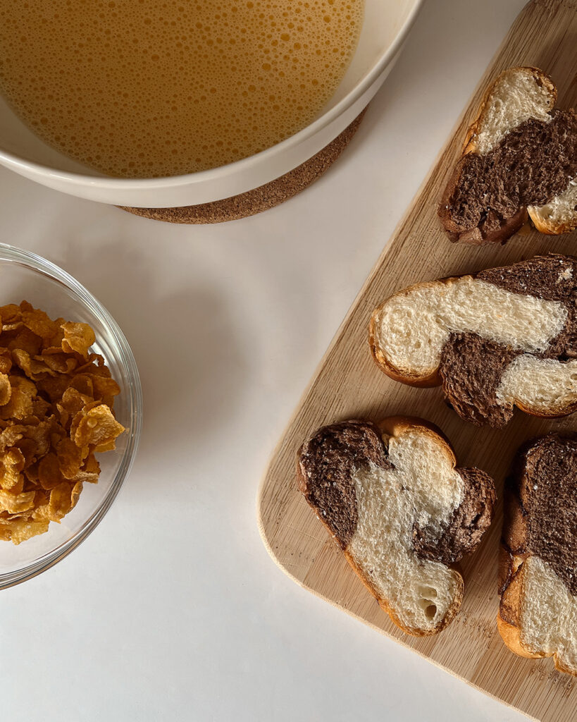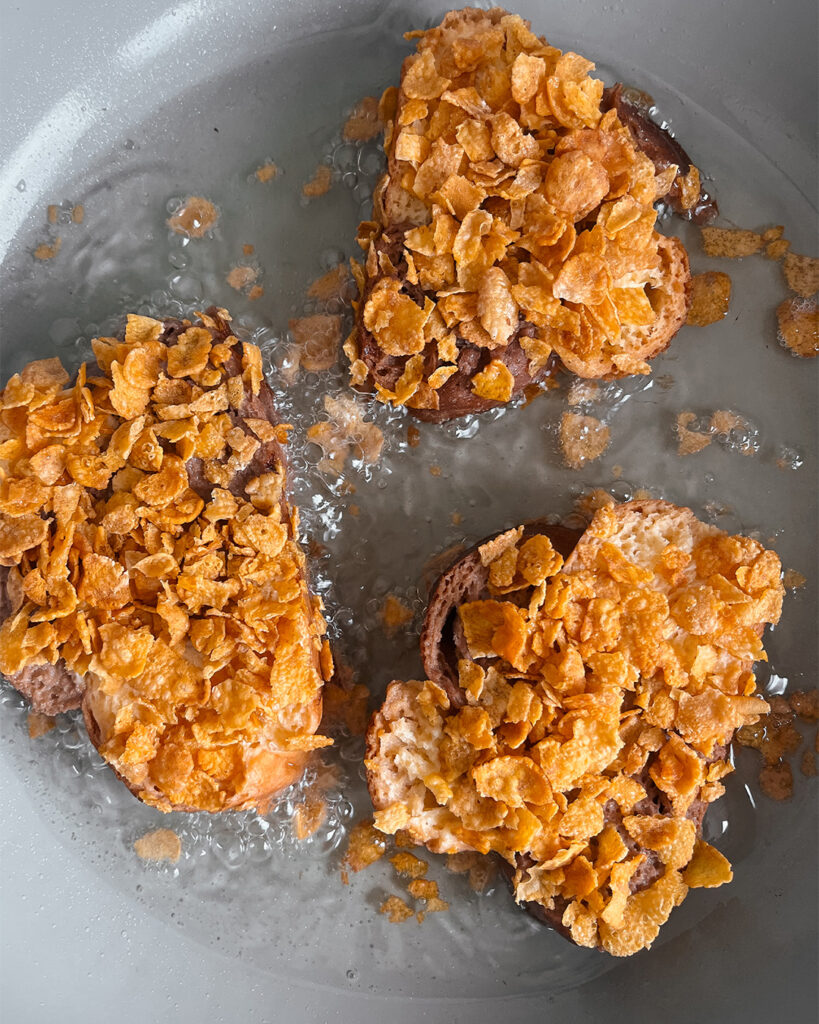 • a kalácsszeleteket áztassuk be a tojásos keverékbe, majd forgassuk bele a kukoricapehelybe
